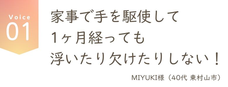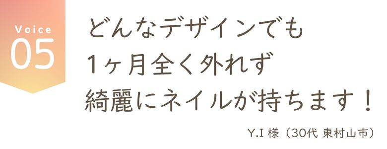 主婦の私にとってネイルを気にせず過ごせるのはとても嬉しく、ネイルチェンジまでストレスフリーで過ごせるのが本当にありがたいです。