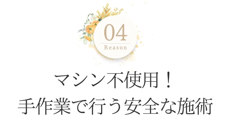 これらのトラブルを未然に防ぎ、繊細な手作業だからこそできる丁寧なケアと施術で、安心して施術をお受けいただけます。
