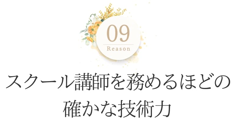 類まれなる技術力と豊富な経験を活かし、多くの生徒からの信頼を得ながら、次世代のネイリスト育成に情熱を注いでいます。
